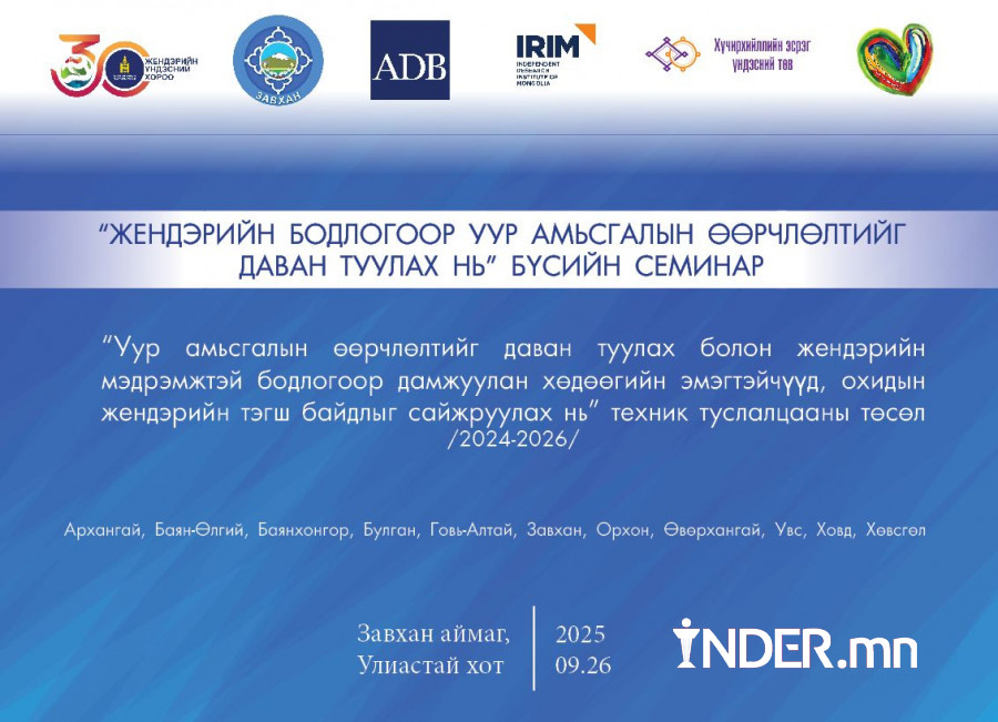 Жендэрийн үндэсний хороо Азийн хөгжлийн банктай хамтран хэрэгжүүлж буй "Уур амьсгалын өөрчлөлтийг даван туулах болон жендэрийн мэдрэмжтэй бодлогоор дамжуулан хөдөөгийн эмэгтэйчүүд, охидын жендэрийн тэгш байдлыг сайжруулах нь" төслийн хүрээнд Завхан аймгийн Улиастай хотод “ЖЕНДЭРИЙН БОДЛОГООР УУР АМЬСГАЛЫН ӨӨРЧЛӨЛТИЙГ ДАВАН ТУУЛАХ НЬ” сэдэвт бүсийн семинар зохион байгуулж байна.