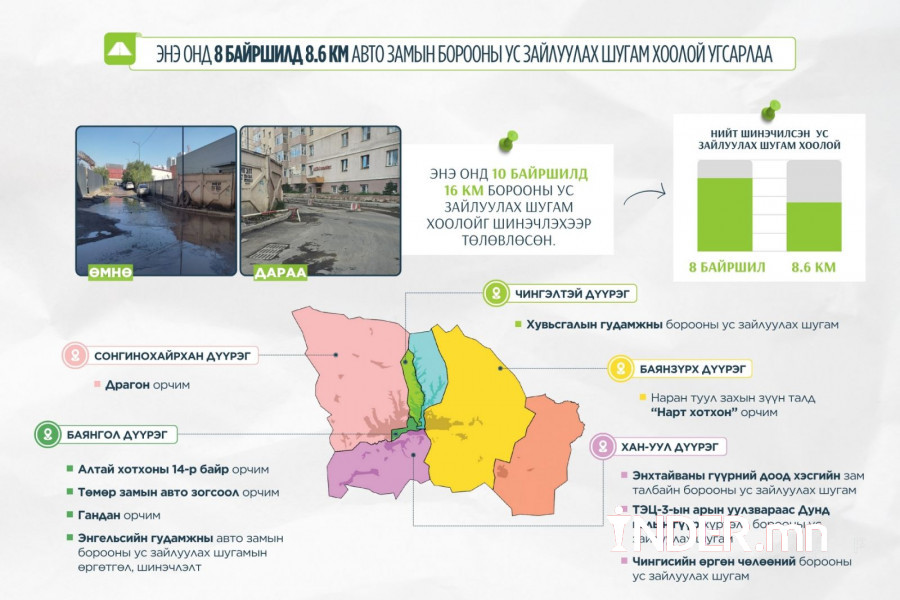 Харин 2026 онд ГУББГ-аас ус тогтдог байршлуудад нийт 30 км борооны ус зайлуулах шугам угсрахаар төлөвлөөд байна.