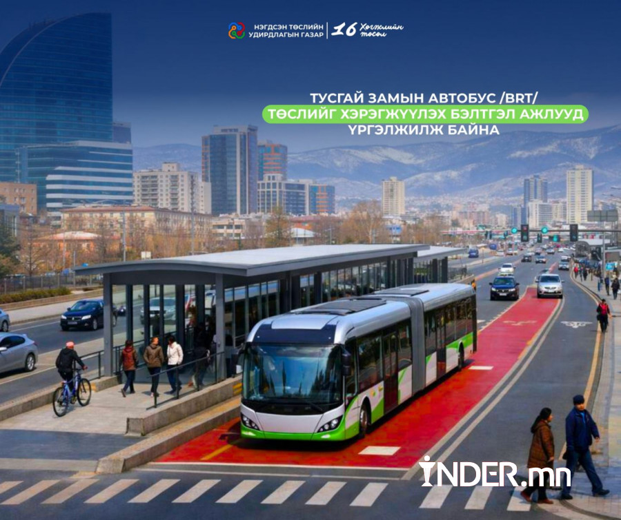 “Тусгай замын автобус /BRT/” төсөл нь зөвхөн нийтийн тээвэрт тусгайлан зориулсан эгнээтэй, түгжрэлээс тусгаарлагдсан нийтийн тээврийн систем юм. Энэхүү төсөл нь хотын төв болон захын дүүргүүдийн хоорондын нийтийн тээврийн урсгалыг хурдан, найдвартай, хүртээмжтэй болгох зорилготой. Төслийг Ард Аюуш өргөн чөлөө-Их тойруу-Намьяжугийн гудамж-Нийслэл хүрээ өргөн чөлөө чиглэлд төлөвлөж буй бөгөөд нийт 12.9 км урт, 19 буудалтай тусгай замын автобусны шугам байх юм.