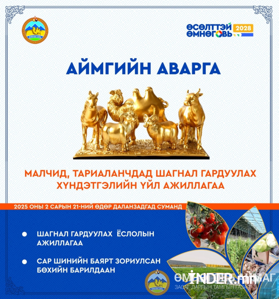 "Аймгийн аварга малчин өрх", "Аймгийн тэргүүний тариаланч"-д шагнал гардуулах хүндэтгэлийн үйл ажиллагаа, сар шинийн барилдааныг 2025 оны 02 сарын 21-ний өдөр Даланзадгад хотод нэгдсэн байдлаар зохион байгуулна.